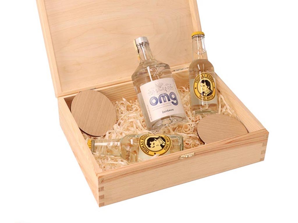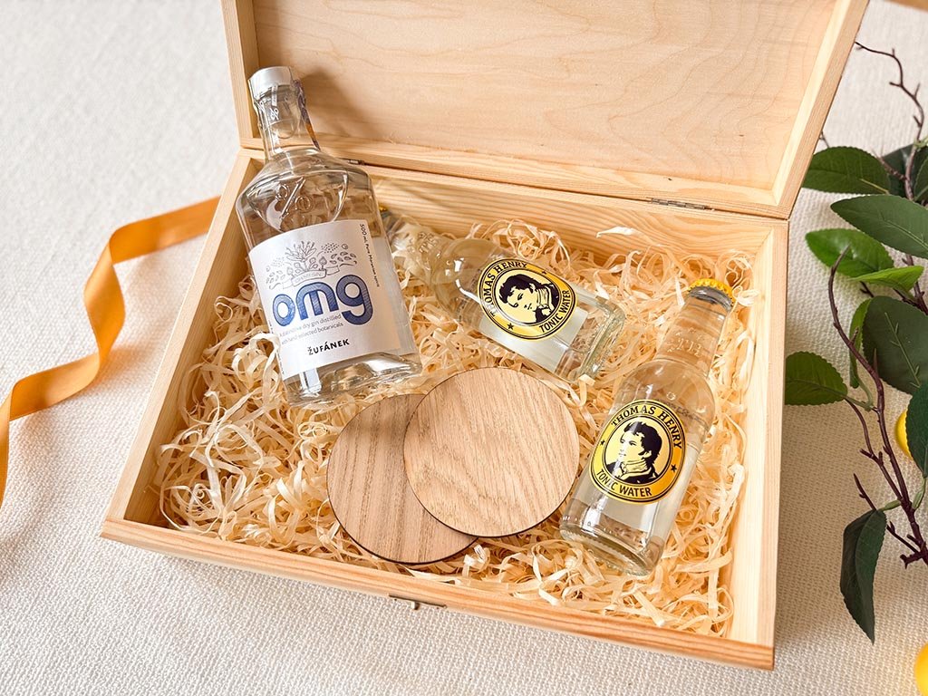 Dárková sada v dřevěné krabičce nabízí dokonalou kombinaci lahodného ginu OMG a originálního dárku na míru. Potěší nejen milovníky a znalce dobrého pití. Je ideálním dárkem k narozeninám, k narození dítěte, radost udělá novomanželům, ale také obchodním partnerům.