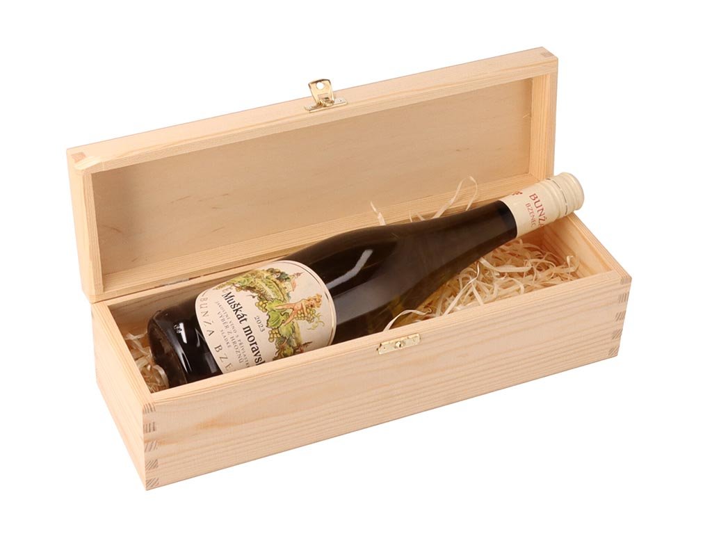 V balení najdete láhev Muškát Moravský 0,75 l. Dřevěná krabička je vystlaná přírodní dřevěnou vlnou, která zajistí nejen bezpečnou přepravu, ale také zdůrazní výjimečnost tohoto originálního dárku.