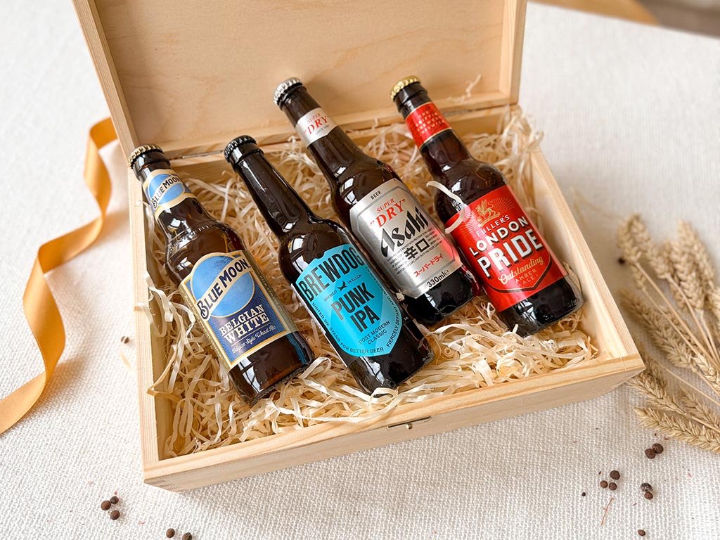 V balení najdete pivní výběr Asahi Super Dry, Blue Moon Belgian White, Fuller's London Pride a BrewDog Dead Pony Club. Všechny láhve mají objem 0,33 l. Dřevěná krabička je vystlaná přírodní dřevěnou vlnou, která zajistí nejen bezpečnou přepravu, ale také zdůrazní výjimečnost tohoto originálního dárku.