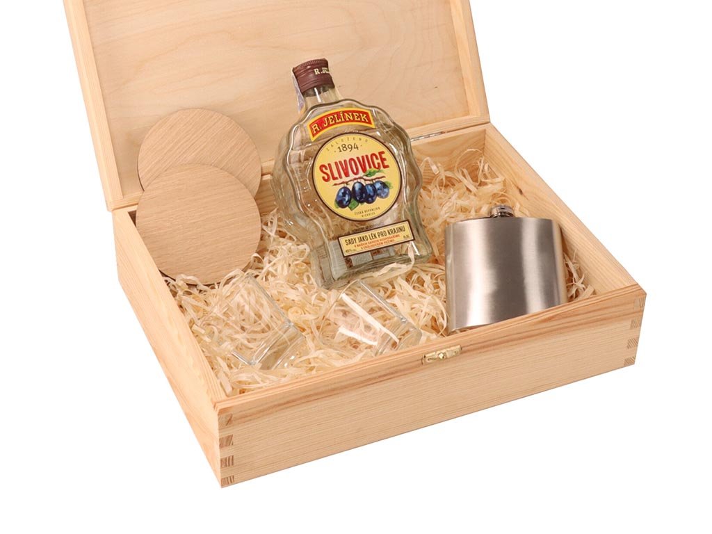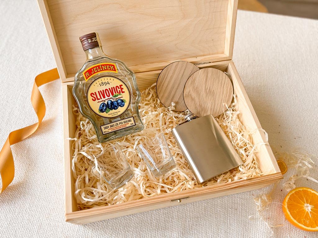 Dárková sada v dřevěné krabičce nabízí dokonalou kombinaci lahodné Slivovice R. Jelínek a originálního dárku na míru. Potěší nejen milovníky a znalce dobrého pití. Je ideálním dárkem k narozeninám, k narození dítěte, radost udělá novomanželům, ale také obchodním partnerům.