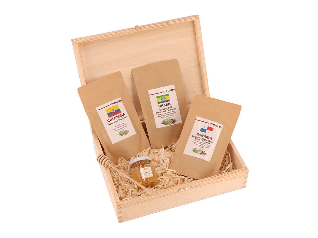 V krabičce najdete tři lahodné kávy a kvalitní med:
