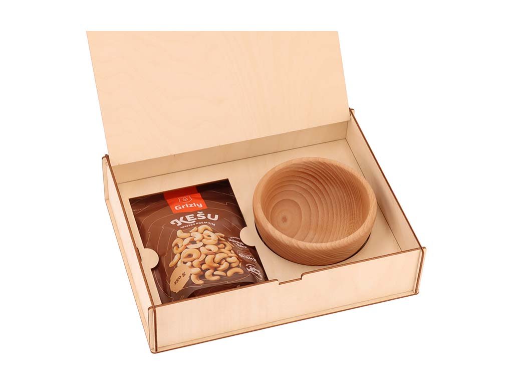 Balení kešu ořechů s miskou v dřevěné krabičce je dárek, který je nejen praktický, ale i krásně zabalený, což dodává na výjimečnosti. Zejména pokud u nás zvolíte možnost doplnění o gravírovaný text nebo obrázek. Vytvoříme tak pro vás například krásný dárek k Valentýnu, originálně zabalený vánoční dárek pro babičku i pozornost pro pana učitele v den vysvědčení.