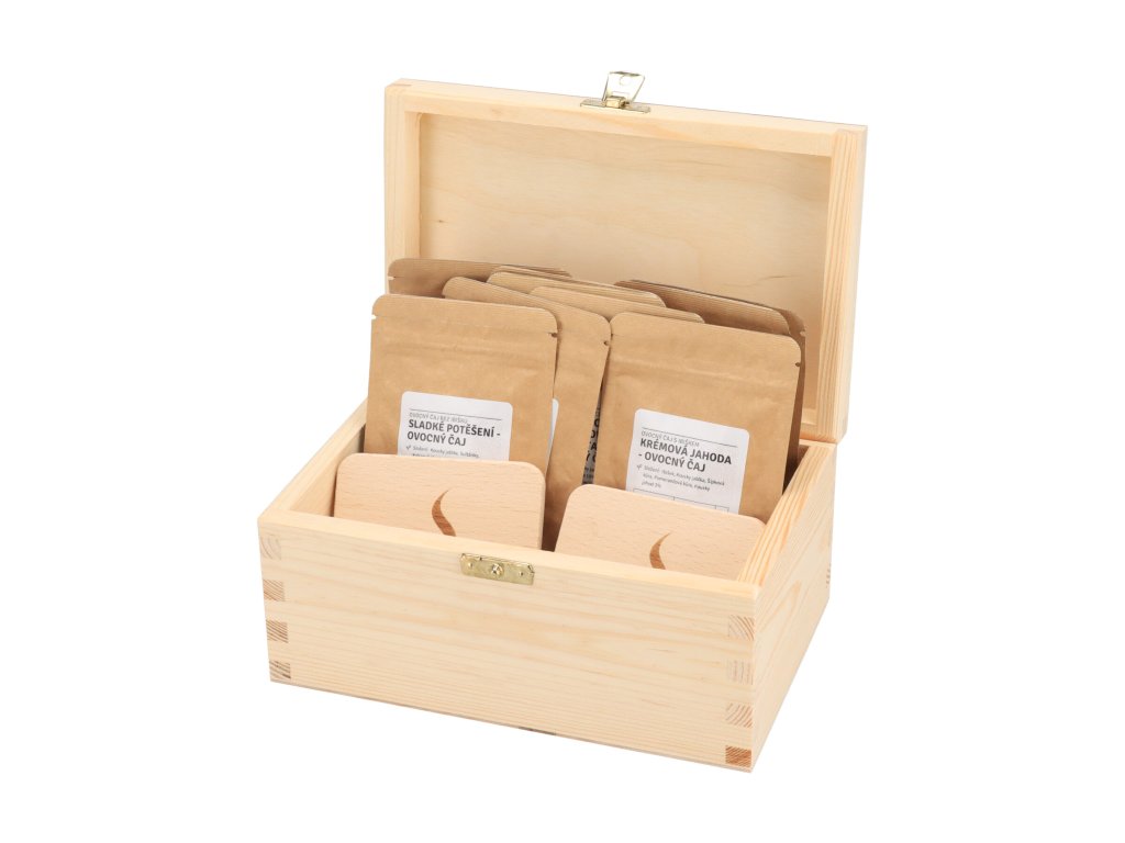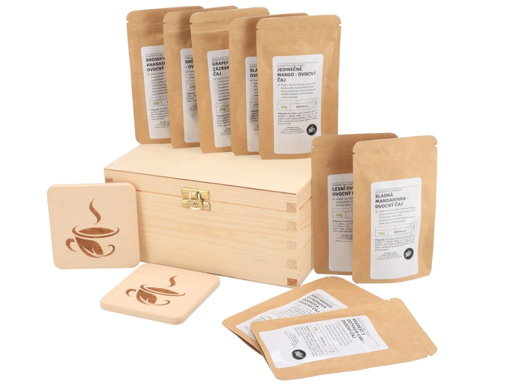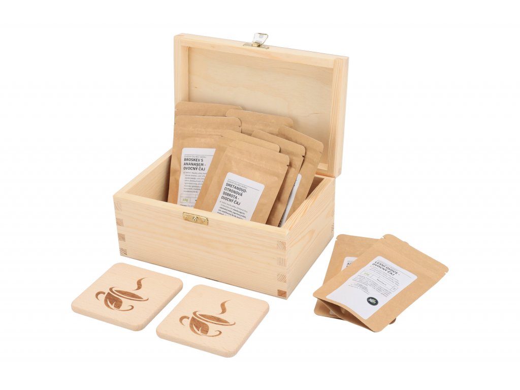 Balení obsahuje dřevěnou krabičku, 10 čajových balíčků a dva dřevěné podtácky s gravírem.