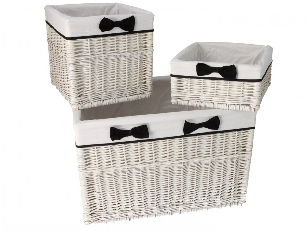 Designový trojdílný set košíků z loupaného proutí vystlaný bílou látkou s ozdobnými mašlemi, který ukryje spousty věcí z Vaší domácnosti.