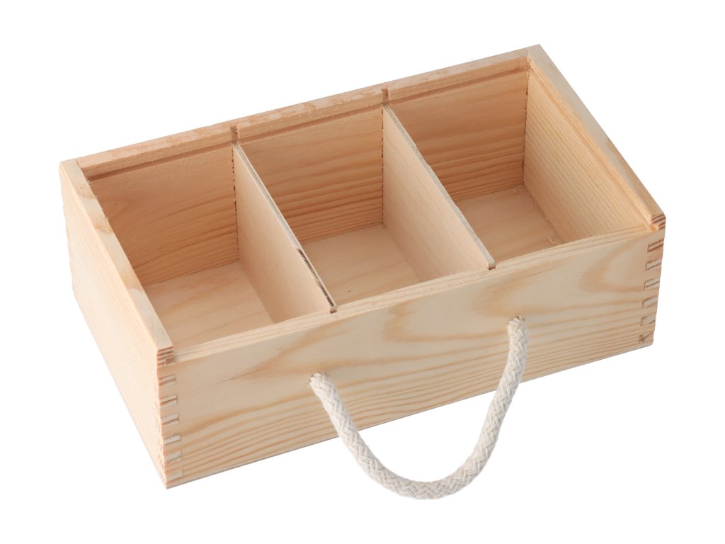 Vnitřní rozměr jedné přihrádky je 12 x 7,3 cm, vnitřek můžete vyplnit například dřevěnou vlnou. Víko z pevné překližky se snadno vysouvá a dělící stěnu lze z krabičky vytáhnout.